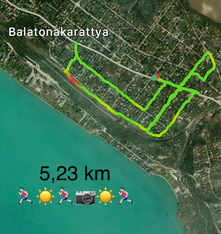A magasparton egy ideig próbáltam a füvön futni, de annyi szúnyogot riasztottam fel, hogy nem tudtam tőlük rendesen lihegni. Maradt a murvás úttest. Utána össze-vissza kanyarogtam a faluban. Szuper volt, hogy szinte mindenhol árnyékban lehettem, hiszen még majdnem vízszintesen sütött a Nap. De megmutatta az erejét, ahol volt egy kis rés, amin átjutottak a sugarai!