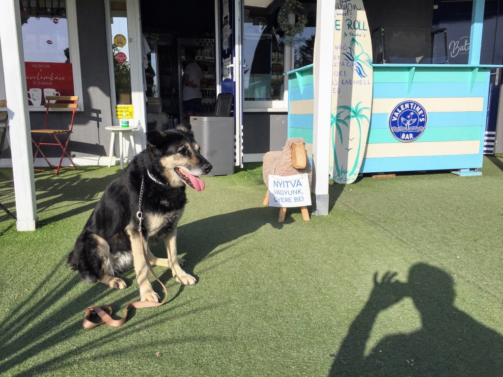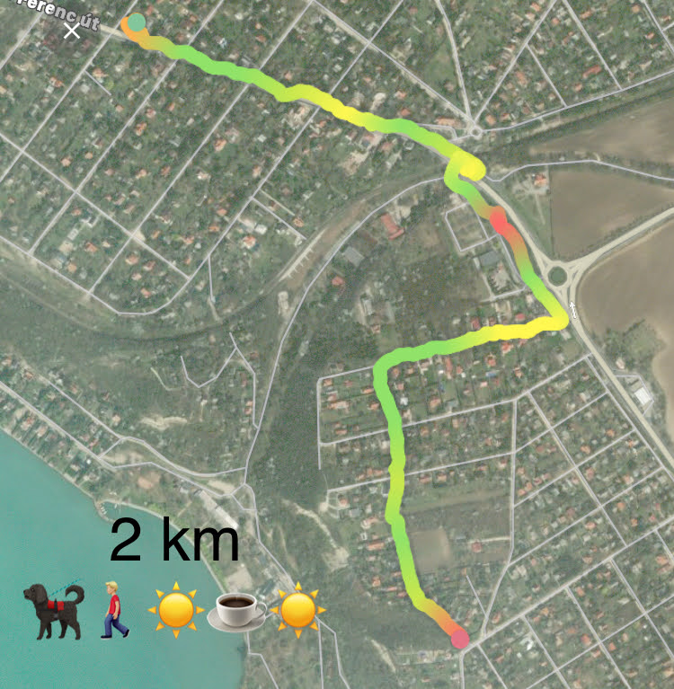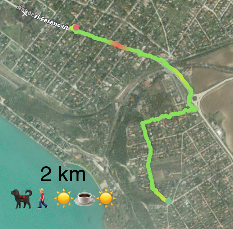Most teljesen rábíztam az útvonalat, éppen csak az első sarkon javasoltam nagyon finoman a magaspart felé fordulást, de nem vette a lapot. Ment tovább határozottan arra a helyre, ahol néhány hétig az esti sörözéseink (ő nem sört kapott) voltak, és ahol szombaton új hely nyílt (ami csak 9-kor nyit). Körülnézett, ivott egy kis vizet, majd a kisbolt felé vette az irányt.