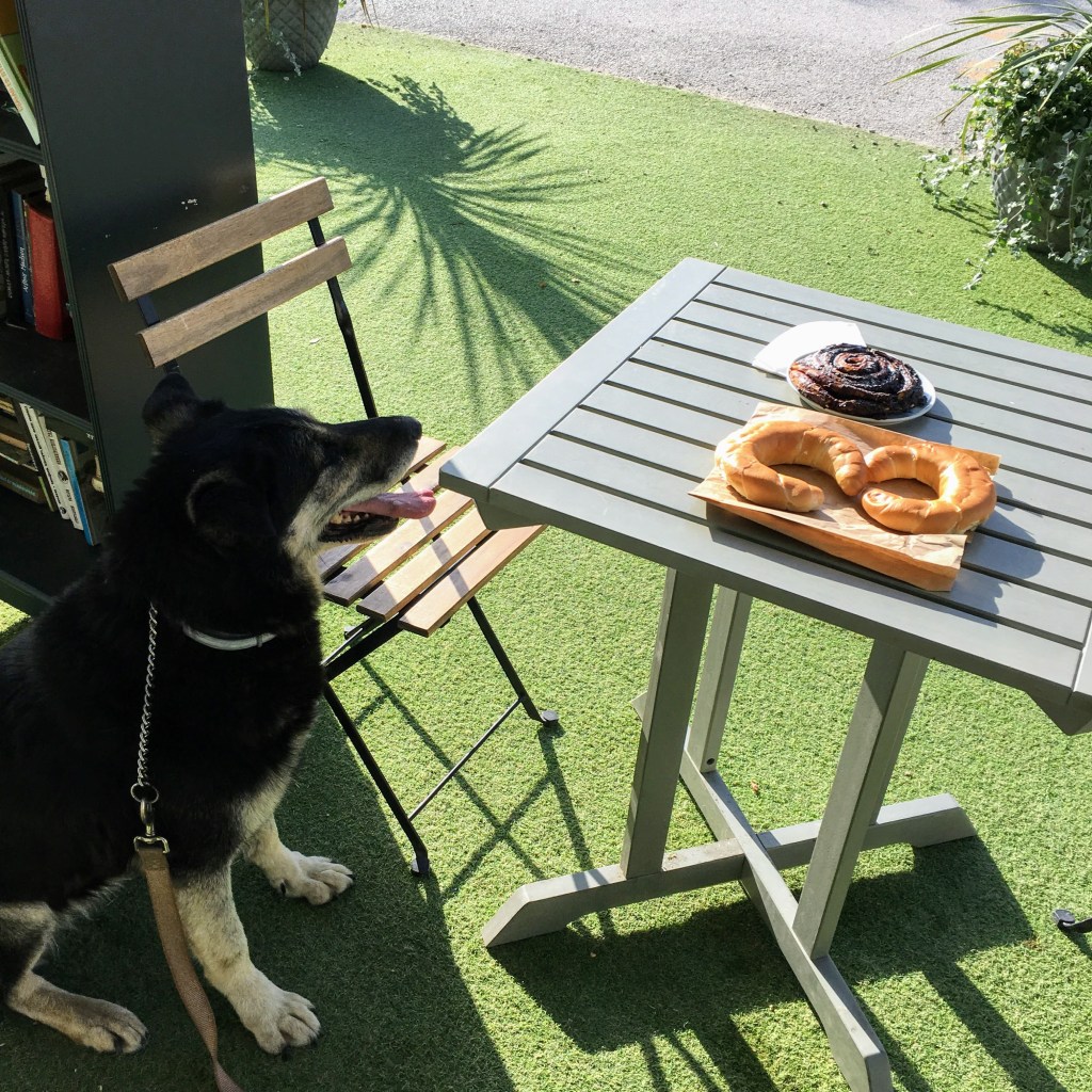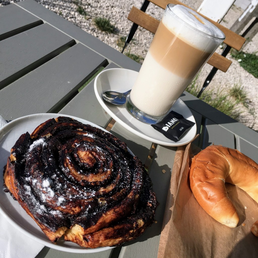 Nem akartam elkedvetleníteni azzal, hogy ott is csak kilenckor nyitnak, de neki lett igaza, most már hétkor. Így megkapta a megszokott két kiflijét. Én pedig a megszokott csokis csigámat, de ma kivételesen hideg tejeskávéval a furakávém helyett.
