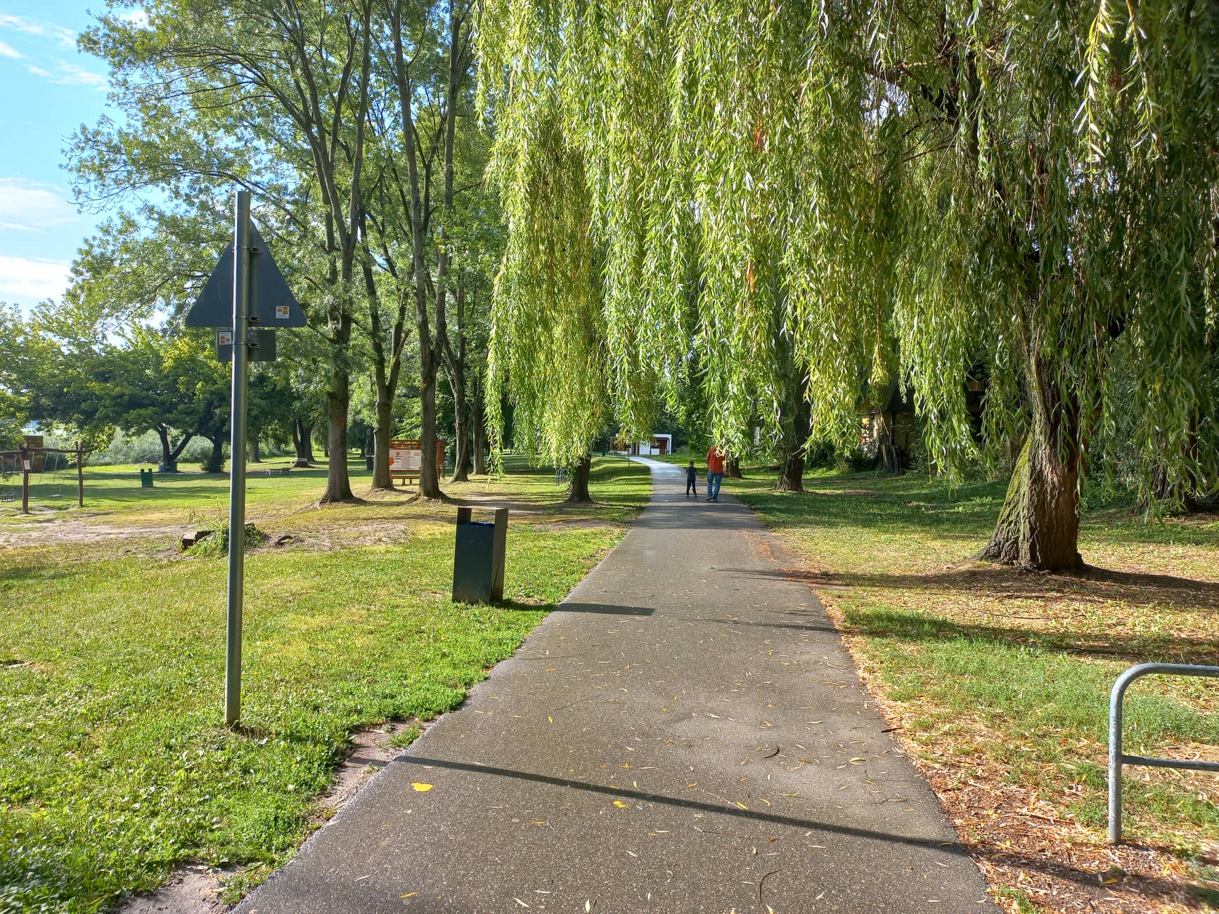 Tovább a part mellett végig jól járható úton haladtam, és igazán csendes volt minden. Itt-ott, elszórva vannak padok, bokrok és fák árnyékában. A pihenőhelyeken asztalok és tájékoztató táblák vannak, amiken a tó állat- és növényvilágáról lehet olvasni és memóriajátékot játszani.